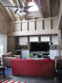 Some room’s cause greater challenges than others like this room in a Lake Champlain VT house. The vertical architecture of this room was so amazing but the furniture was